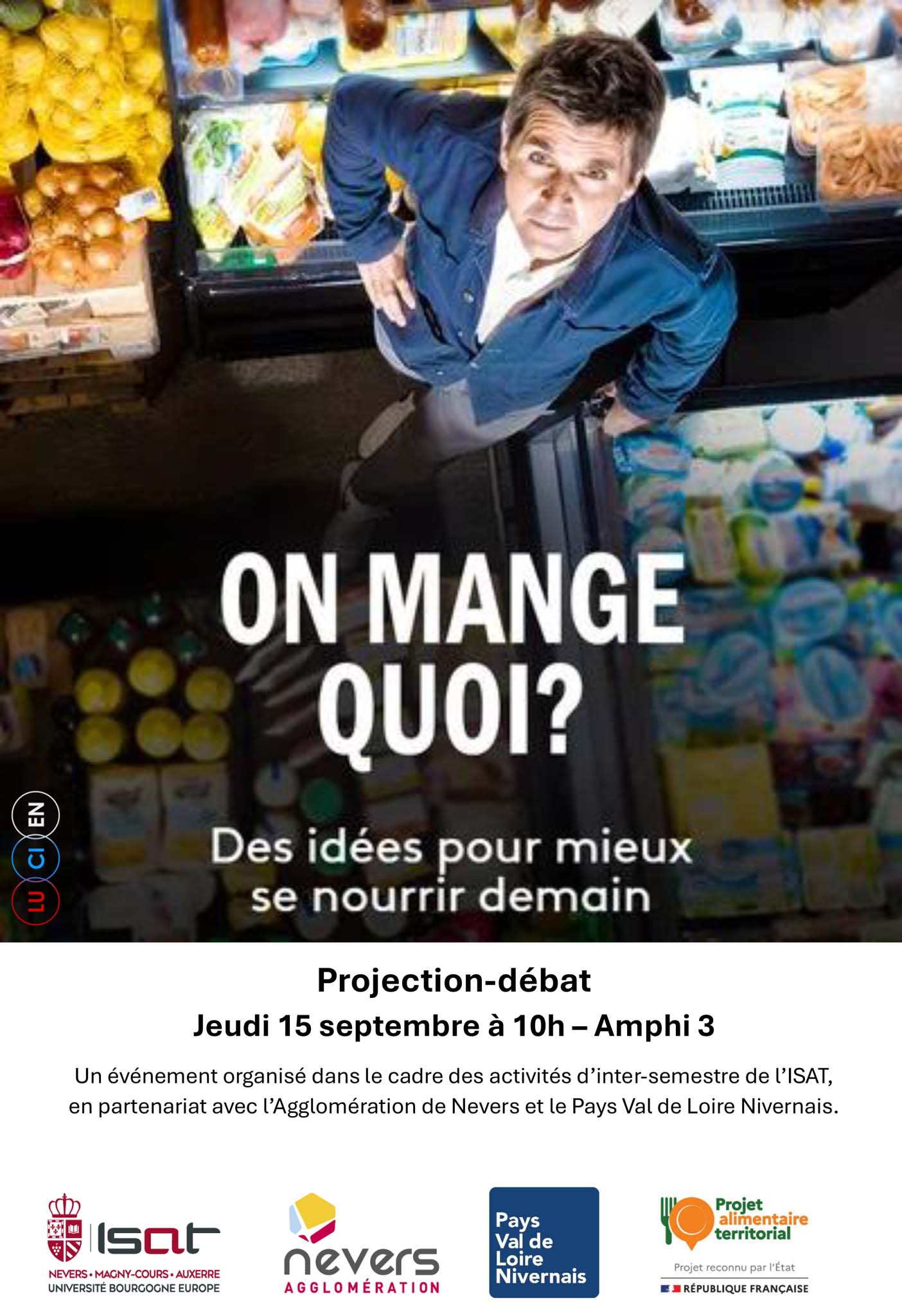 - Une projection du film « On mange quoi ? Des idées pour mieux se nourrir demain » de Bertrand Delapierre, Sophie Roland / 2025 / Lucien TV (lucien prod), Balles Neuves