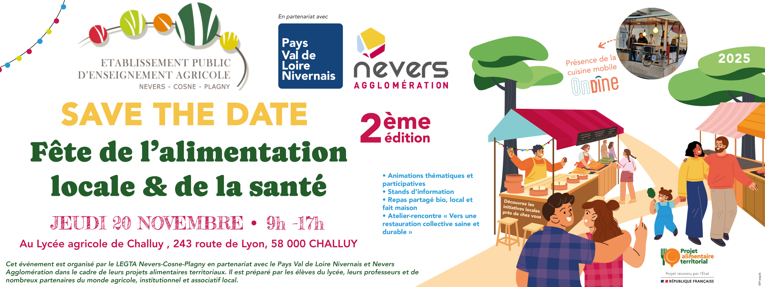 Cet événement est organisé par le LEGTA Nevers-Cosne-Plagny en partenariat avec le Pays Val de Loire Nivernais et Nevers Agglomération dans le cadre de leurs projets alimentaires territoriaux.