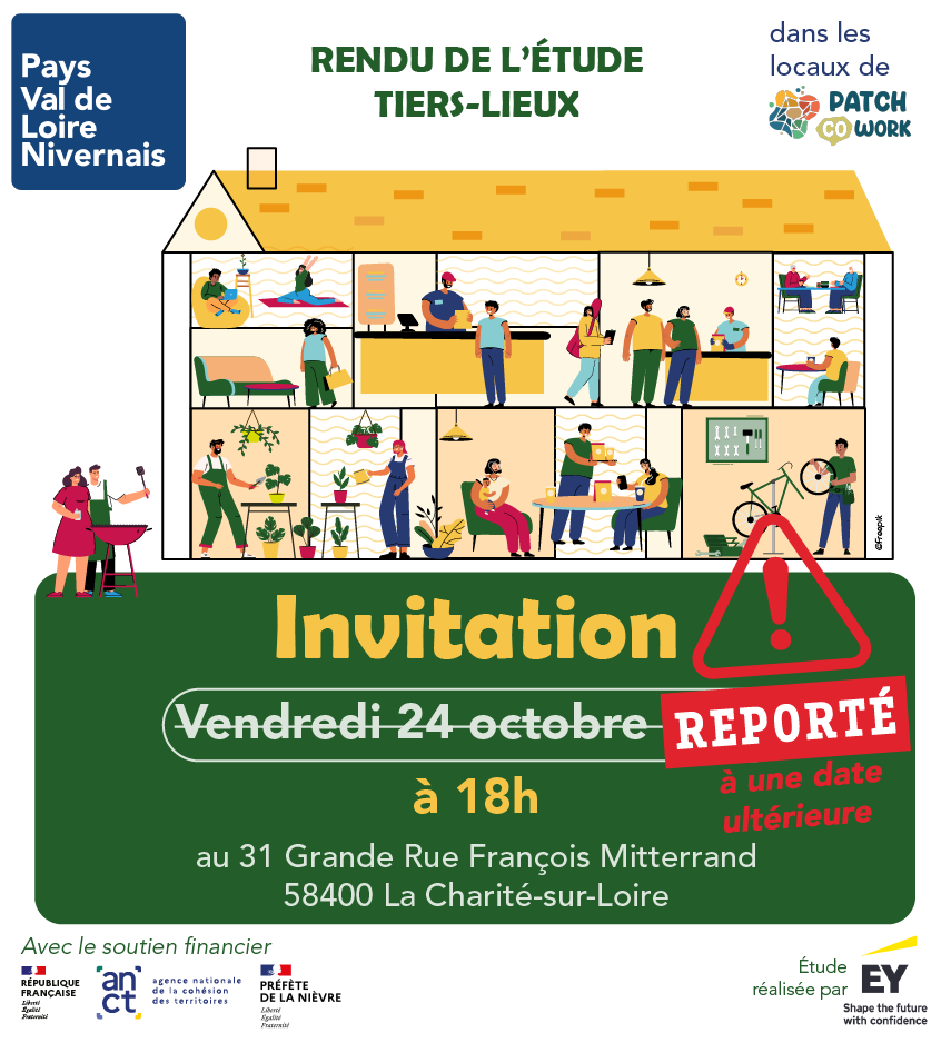 Rendu de l’étude tiers-lieux – octobre 2025 Invitation pour le rendu de l’étude tiers-lieux le : 📅 Reporté à une date ultérieure Information + Ajouter à mon Agenda Google + iCal / Outlook export 00 jours 00 heures 00 minutes 00 secondes Date Oct 24 2025 Heure 18h00 Catégorie Réunion Partagez cet événement