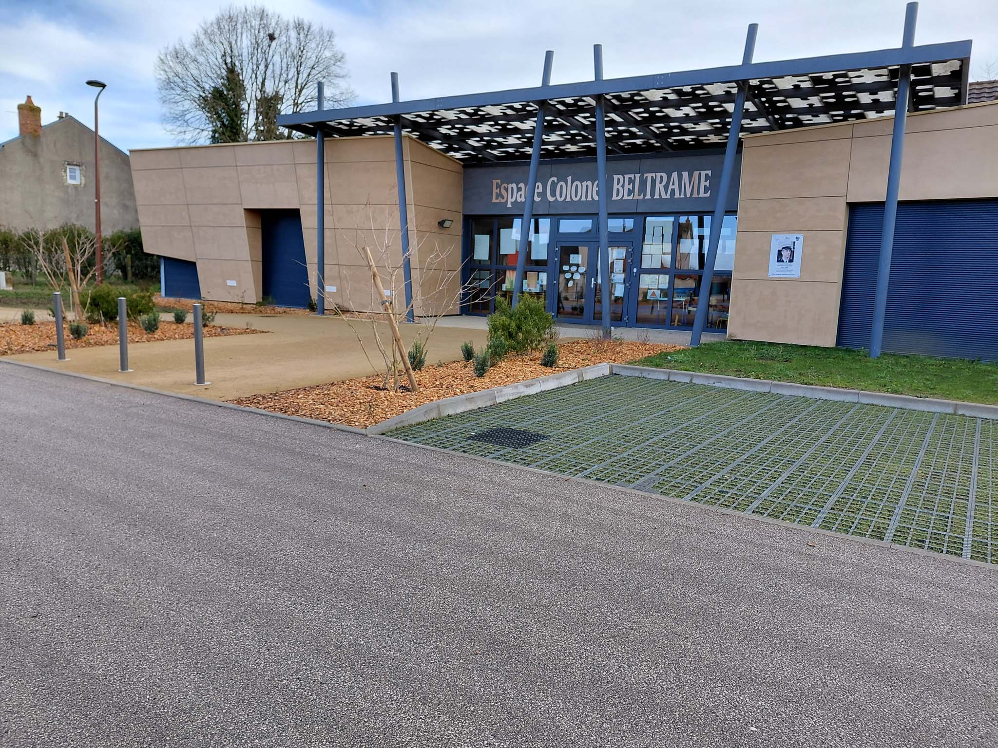 Respirer : + d’espaces verts (une surface de plus de 2 600 m2 a été désimperméabilisée). Dans un objectif de renaturation, de nombreux espaces verts ont été créés, accueillant diverses espèces végétales – arbres, arbustes, haies, plantes peu consommatrices d’eau – favorisant ainsi la biodiversité et contribuant au rafraichissement de l’espace public. Certains revêtements de chaussée ont fait l’objet d’un traitement mécanique de blanchiment pour lutter contre l’effet de chaleur. Les parkings sont constitués de dalles engazonnées pour lutter également contre l’effet de réchauffement et contribuer au verdissement du site.